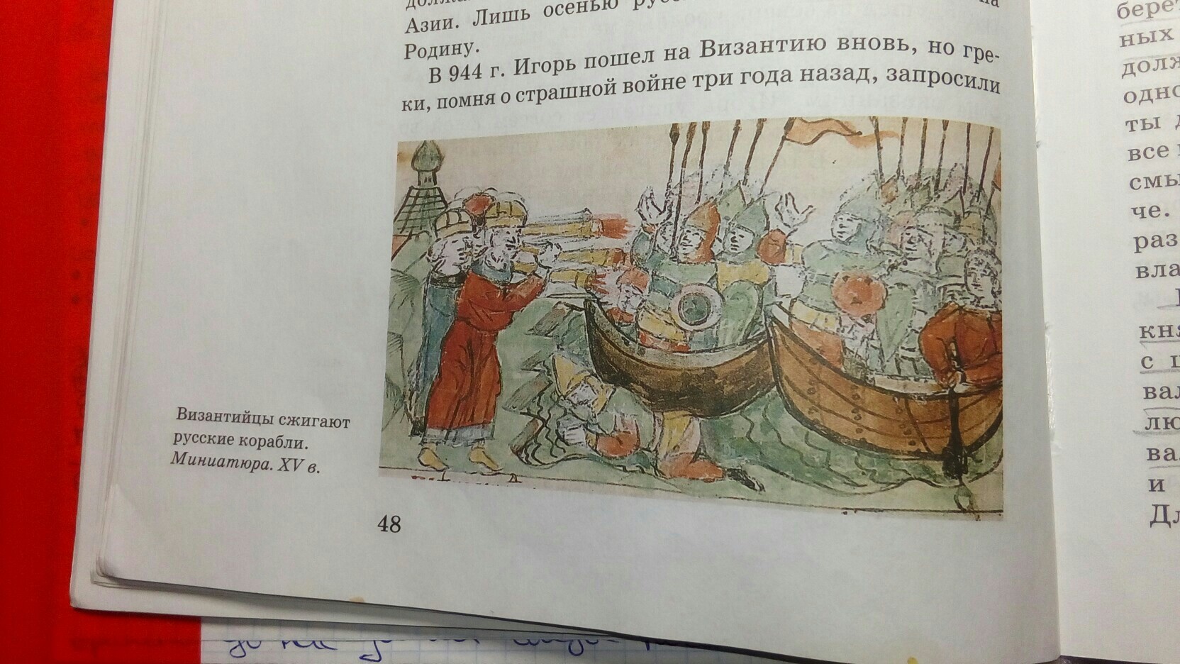 На картинке изображено оружие в действии; слева — византийцы с «греческим огнем», а справа — русские, приближающиеся к стенам столицы Византийской империи — Константинополя.