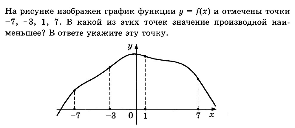 Про производную, грубо говоря, стоит помнить одно - чем круче, тем больше. Значит значение производной наименьшее там, где она почти горизонтальна. В данном случае в точке х = 1