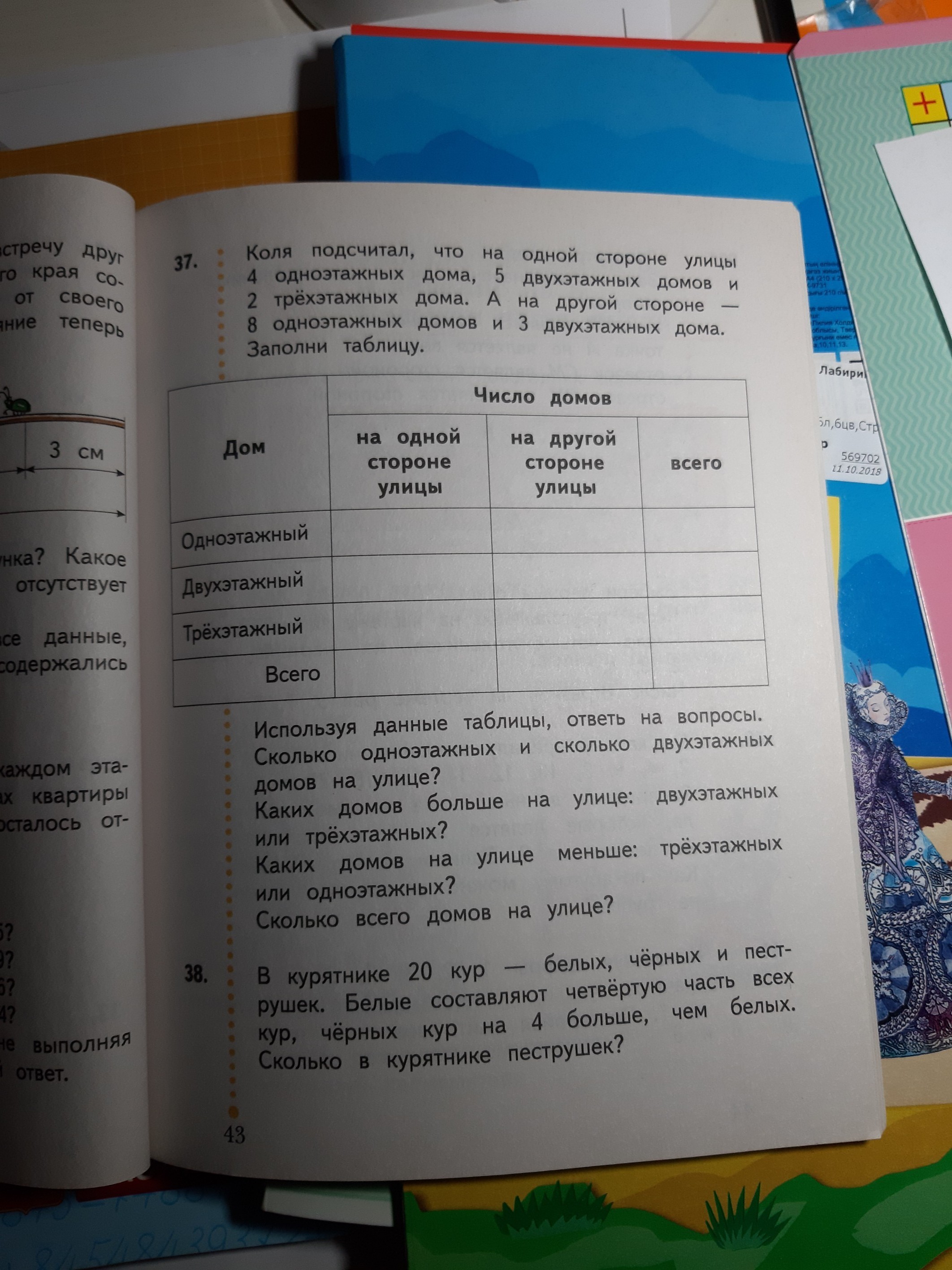 1) 4+5+8+3=20- одноэтажных и двухэтажных домов. 2) (5+3)-2=6 - больше двухэтажных домов 3) ( 4+8)-2=10 -больше одноэтажных домов. 4) 4+5+2+8+3=22- дома всего