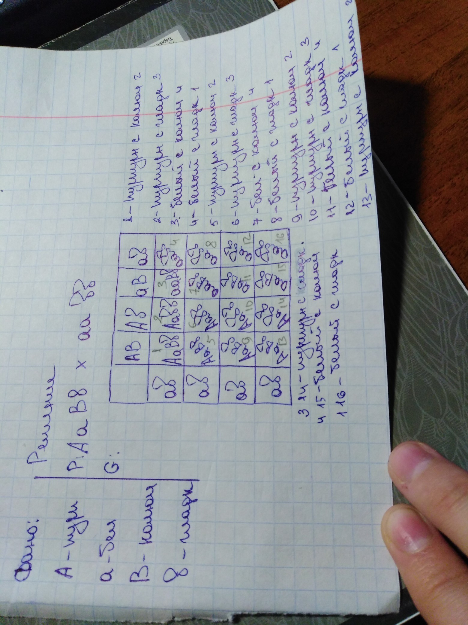 растение дурман с пурпурными цветками(А) и колючими коробочками(В) скрестили с растением имеющим белые цветки и гладкие коробочки. В потомстве получены 25%с белыми цветками и гладкими коробочками. Какова вероятность пурпурных цветков и белых с колючими коробочками
