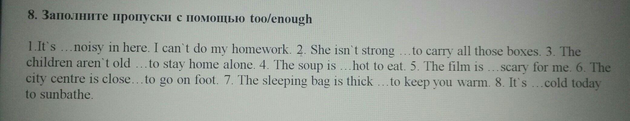 1.It is too noisy in here.2.She is not strong enough to carry all those boxes.3.The children are not enough old to stay home alone.4.The soup is too hot to eat.5.The film is too scary for me.6.The city center is close enough to go on foot.7.The sleeping bag is thick enough to keep you warm.8.It is too cold today to sunbathe.