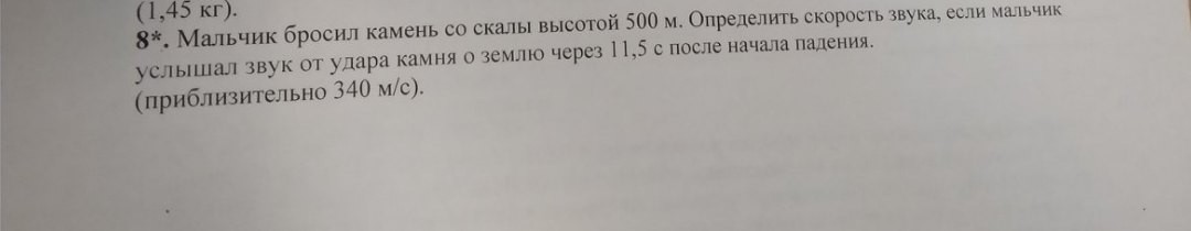 Мальчик бросил камень со скалы 500 м. Определить скорость звука , если мальчик услышал звук от удара о землю через 11,5 с после начала падения