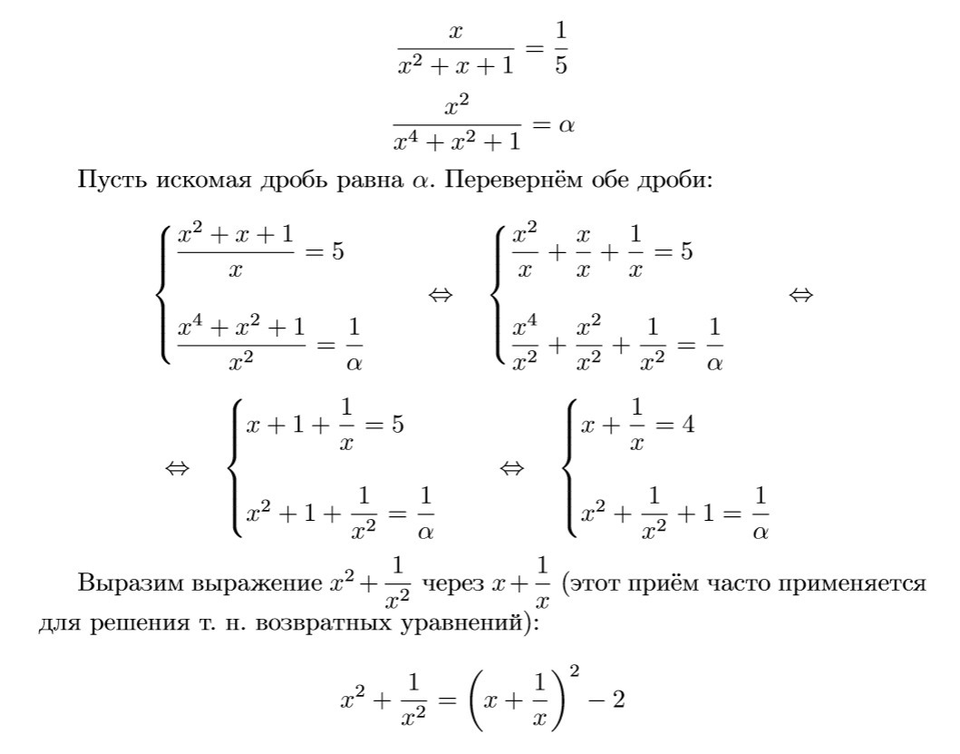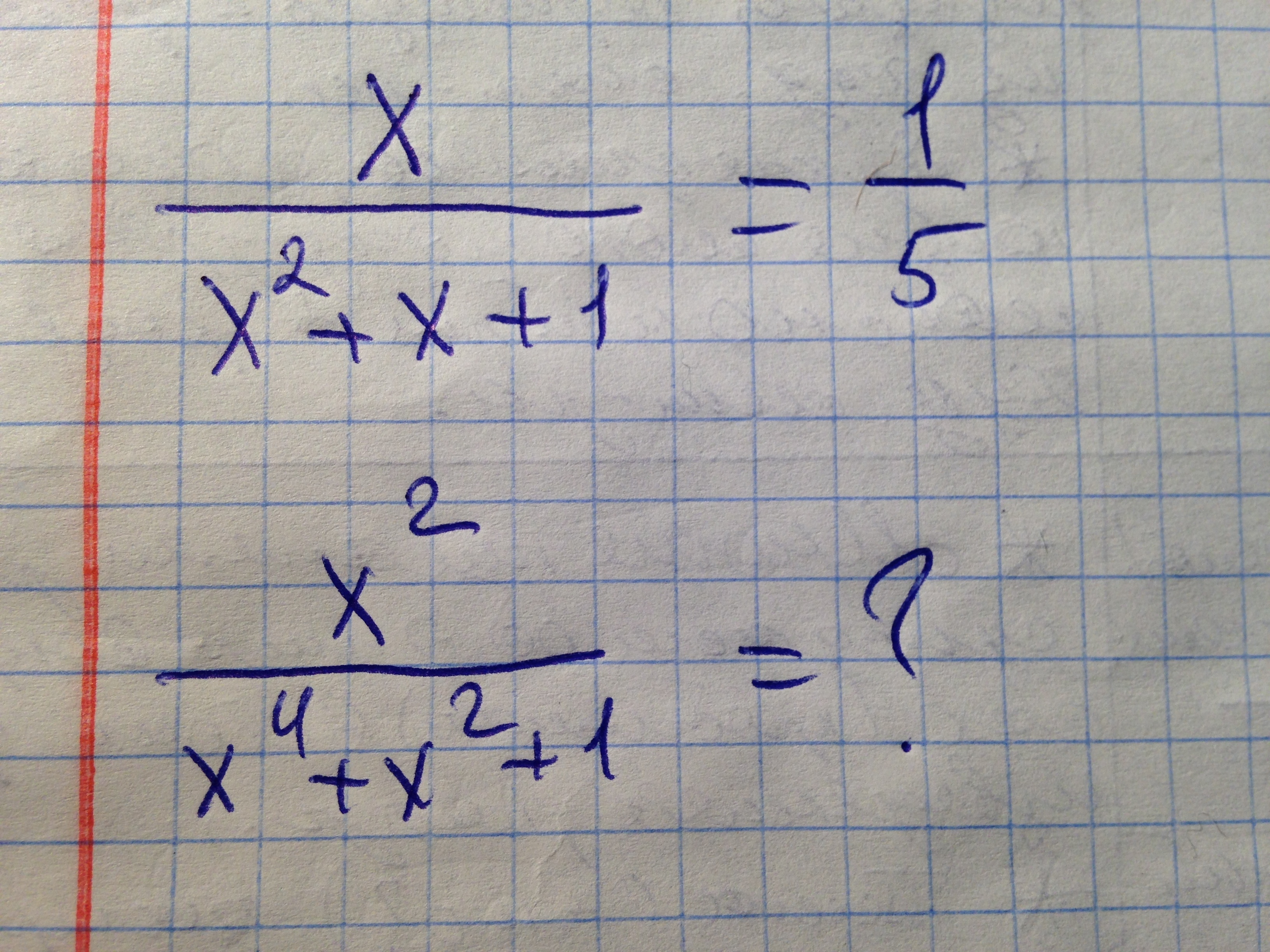 Если x/x^2+x+1 = 1/5 то тогда чему будет равна дробь x^2/x^4+x^2+1 = ?