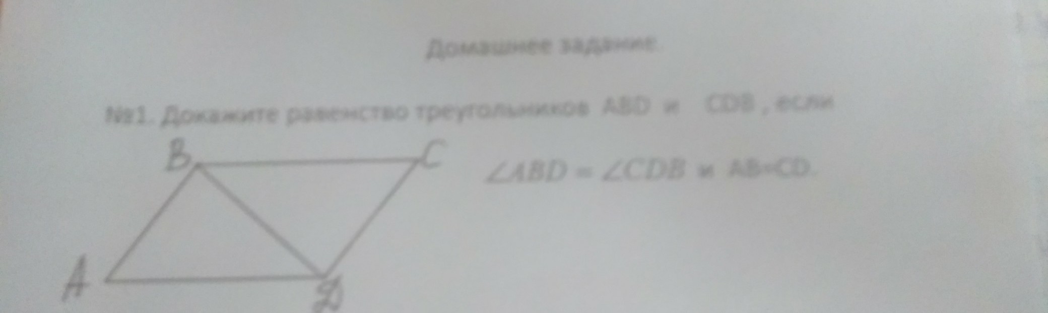 ΔABD = ΔCDB по двум равным сторонам и углу между ними (первый признак равенства треугольников)