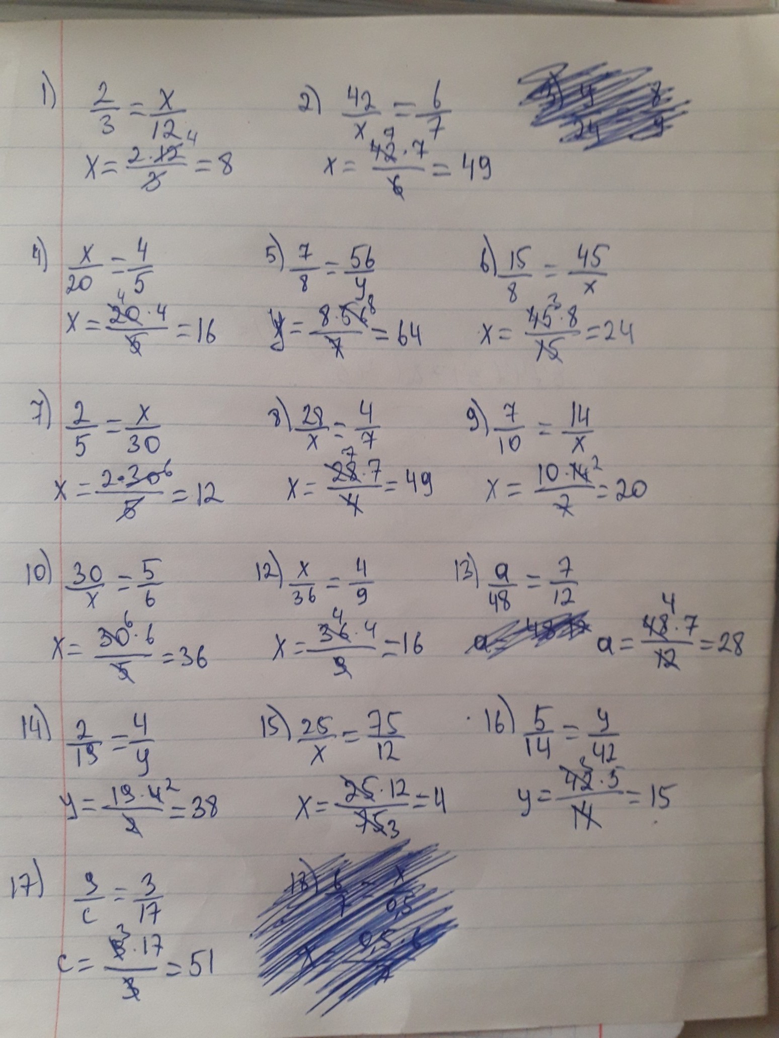 1)2/3=x/12 2)42/x=6/7 3)y/24=8/9 4)x/20=4/5= 5)7/8=56/y 6)15/8=45/x
