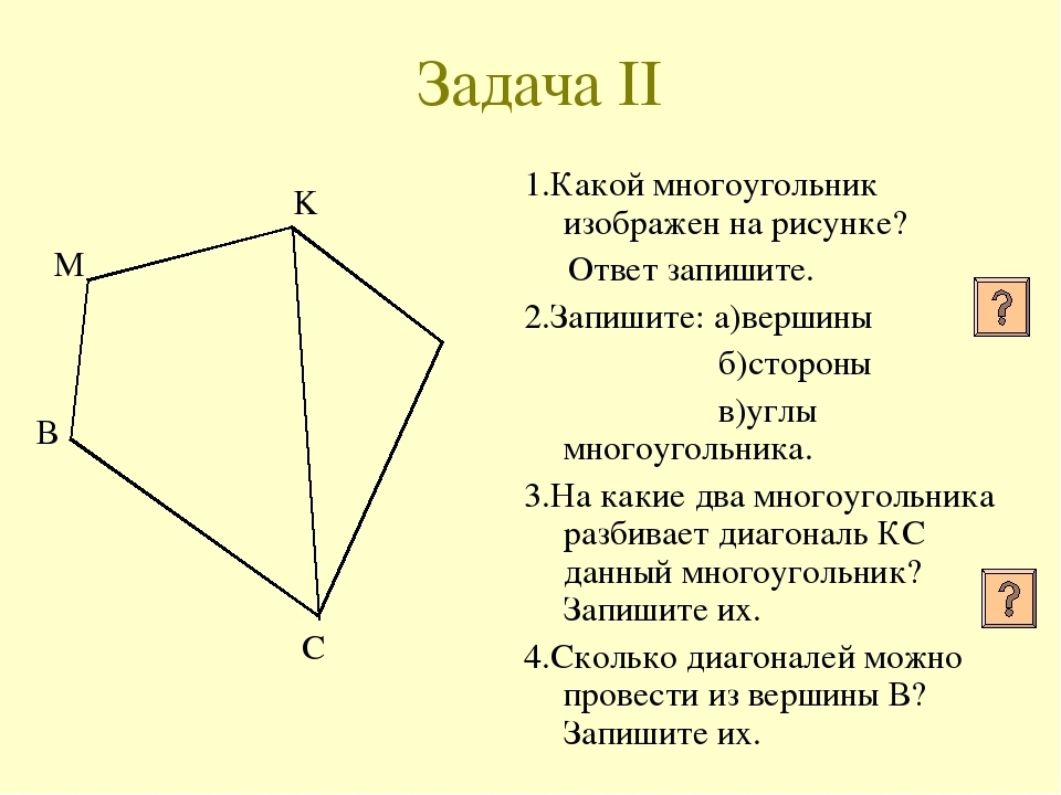 1. какой многоугольник изображен на рисунке? 2.Запишите а)Вершины б)стороны в) углы 3. На какие два многоугольника разбивает диоганаль КС данный многоугольник? запишите их 4) Сколько диоганалей можно провести из вершины В запишите их
