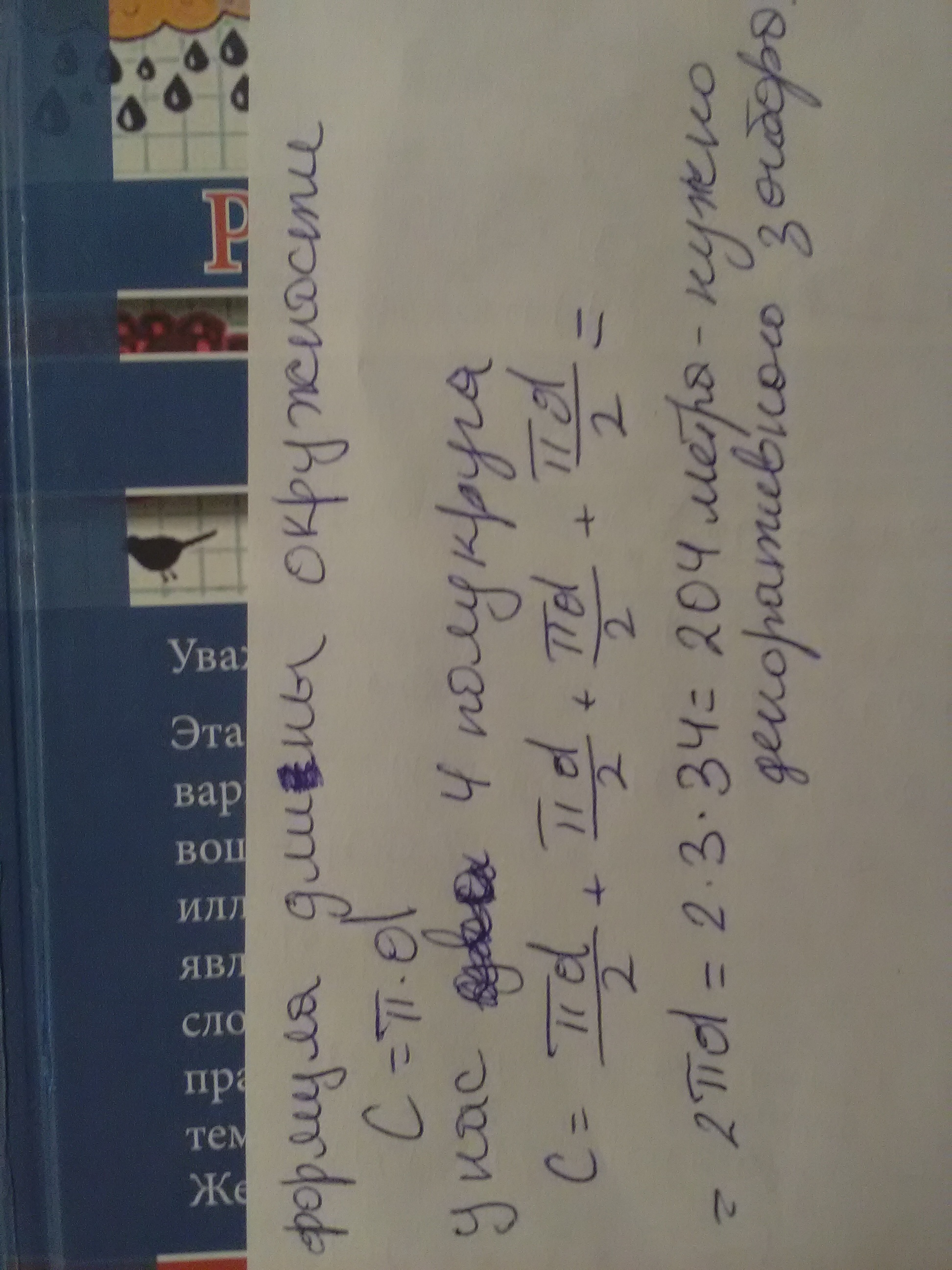 С= 4* (пd/2)= 2*пd= 2*3*34=204 метра длина забора