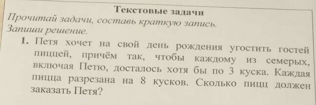 Петя хочет на свои именины угостить 7 гостей пиццей, так , чтобы каждому досталось по 3 куска. сколько пицц нужно заказать, если каждая разрезана на 8 кусков? как-то так