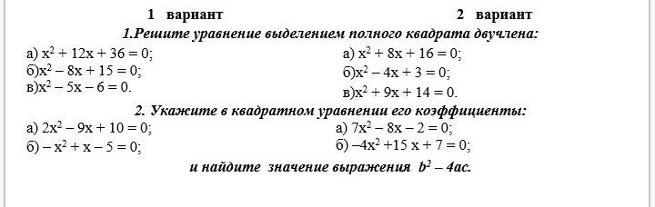N1\x^2+12x+36=0\(x+6)^2=0\x=-6\Otvet: -6\\x^2-8x+15=0\(x-4)^2=1\x-4=^+_-1\x_1=3\x_2=5\Otvet:3;5\\x^2-5x-6=0\x^2-2frac{5}{2}+frac{25}{4}=6+frac{25}{4}\(x-frac{5}{2})^2=frac{49}{4}\x-frac{5}{2}=^+_-frac{7}{2}\x_1=-1\x_2=6\Otvet:-1;6\\N2\2x^2-9x+10=0\a=2; b=-9; c=10\b^2-4ac=(-9)^2-4*2*10=81-80=1\\-x^2+x-5=0\a=-1;b=1;c=-5\b^2-4ac=1^2-4*(-1)*(-5)=1-20=-19