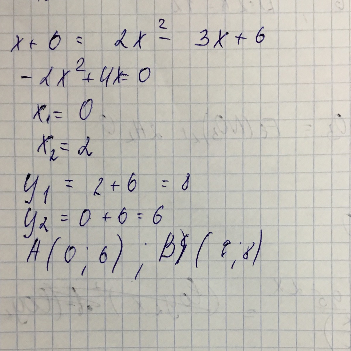 Не виконуючи побудови, знайдіть координати точок перетину графіків функцій у=х+6 і у=2х²-3х+6.