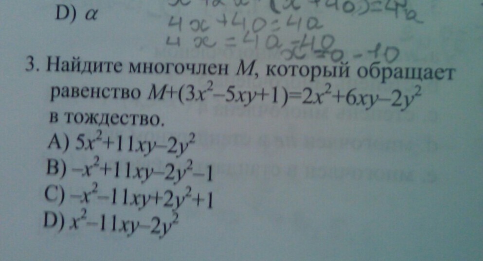 Тождеством называют такое уравнение когда слева от знака равенства написано то же что и справа. т.е. нам нужен такой многочлен, который в сумме с многочленом в скобках даст то, что после равно написано.