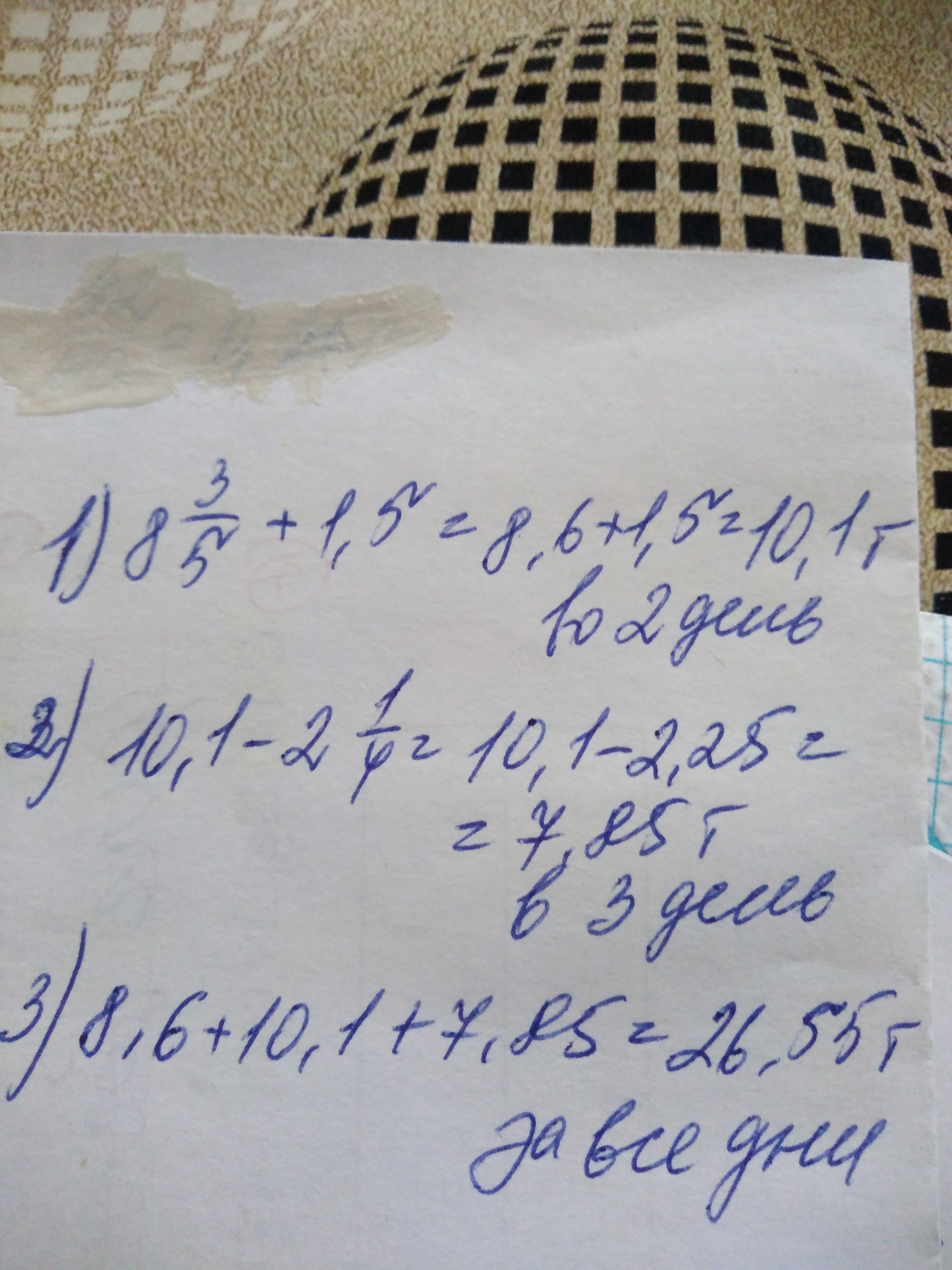 В первый день бассейин налили 8 3/5 тон воды. Во второй день на 1, 5 больше. В третьий день на 2 1/4 тон меньше чем во второй день. Сколько тон воды налили в бассейин