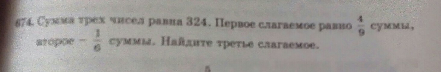 1/6=3/18; 4/9=8/18;значит 3 число ровно 18/18 - 3/18 - 8/18= 7/18 суммы следует вывод 324 * 7 : 18= 126