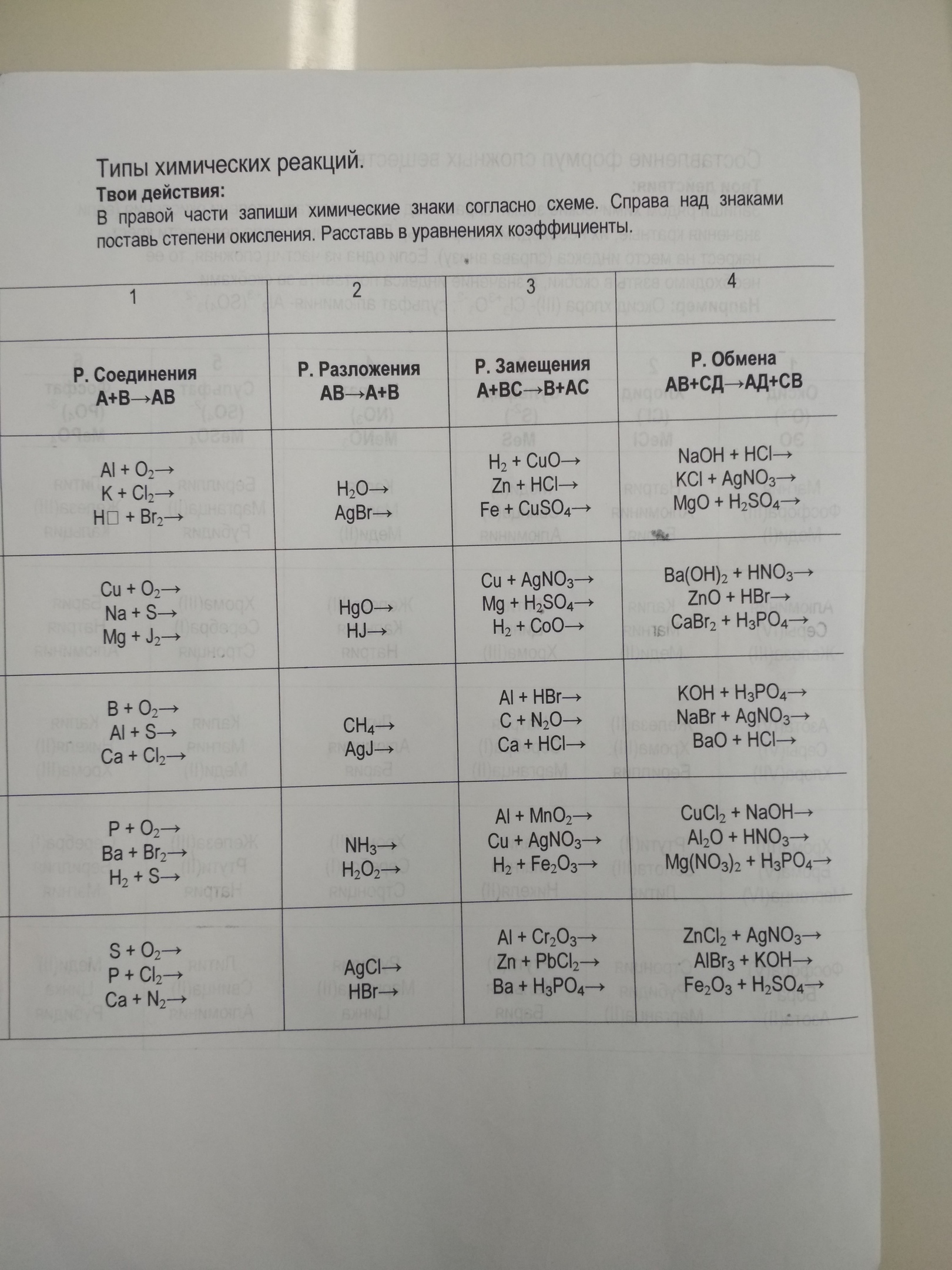 На 1 и 2 фото будут реакции соединения.Карандашом над элементами обозначены степени окисления.Чистый металл, молекулярный кислород - простые вещества. Они стоят из атомов одного химического элемента, поэтому не имеют степени окисления. На 3 фото будут реакции разложения. На 4 и 5 фото реакции замещения