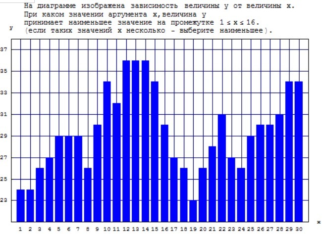 На диаграмме изображена зависимость величины y от величины x. При каком значении аргумента x , величина y принимает наименьшее значение на промежутке 1 ≤ x ≤ 16. Если таких значений x несколько выберите наименьшее.