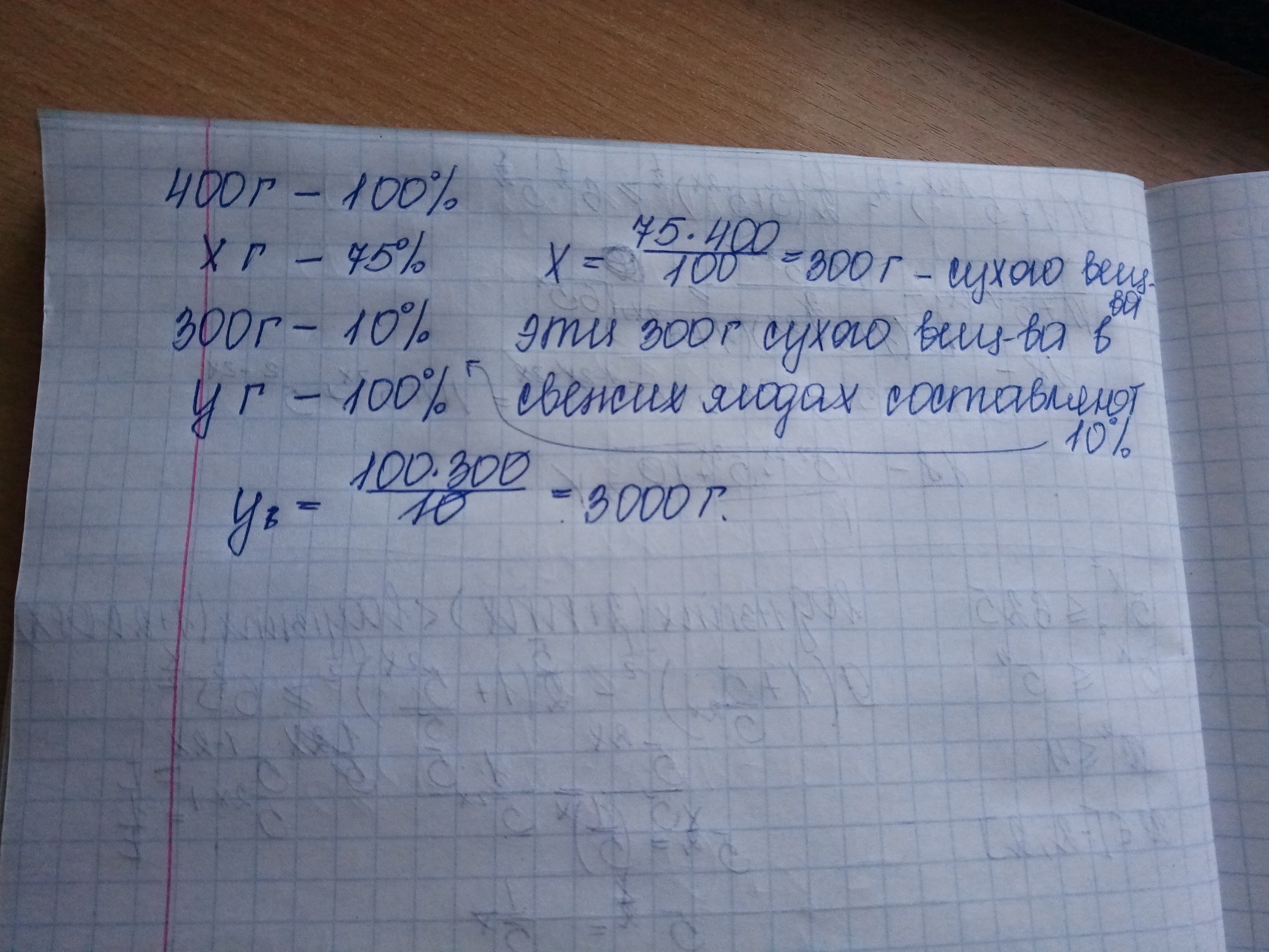 влага в свежих ягодах составляет 90%, а в сушеных 25% влаги. Сколько свежих ягод надо взять, чтобы получить 400г сушеных?