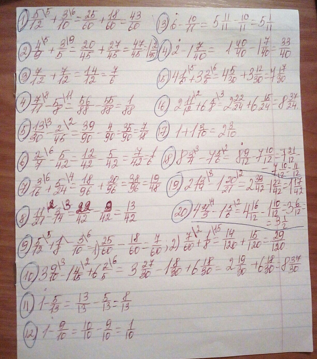 1) 5/12+3/10=25/60+18/60=43/60 Общий знаменатель 60. В первой дроби числитель умножаем на 5, во второй на 6. складываем числители и получаем ответ.