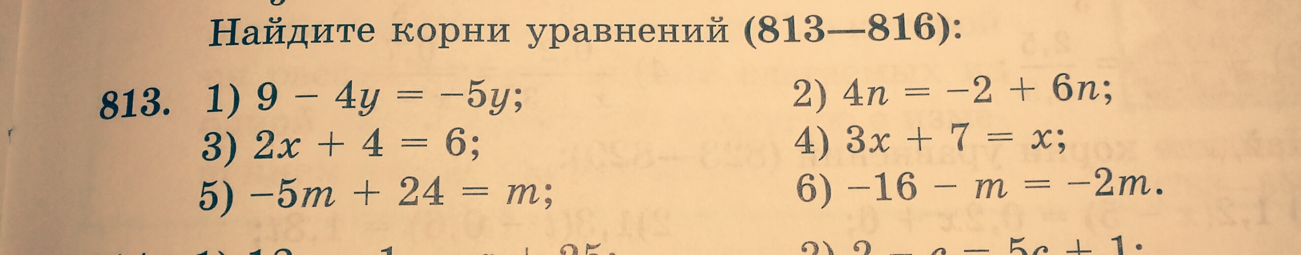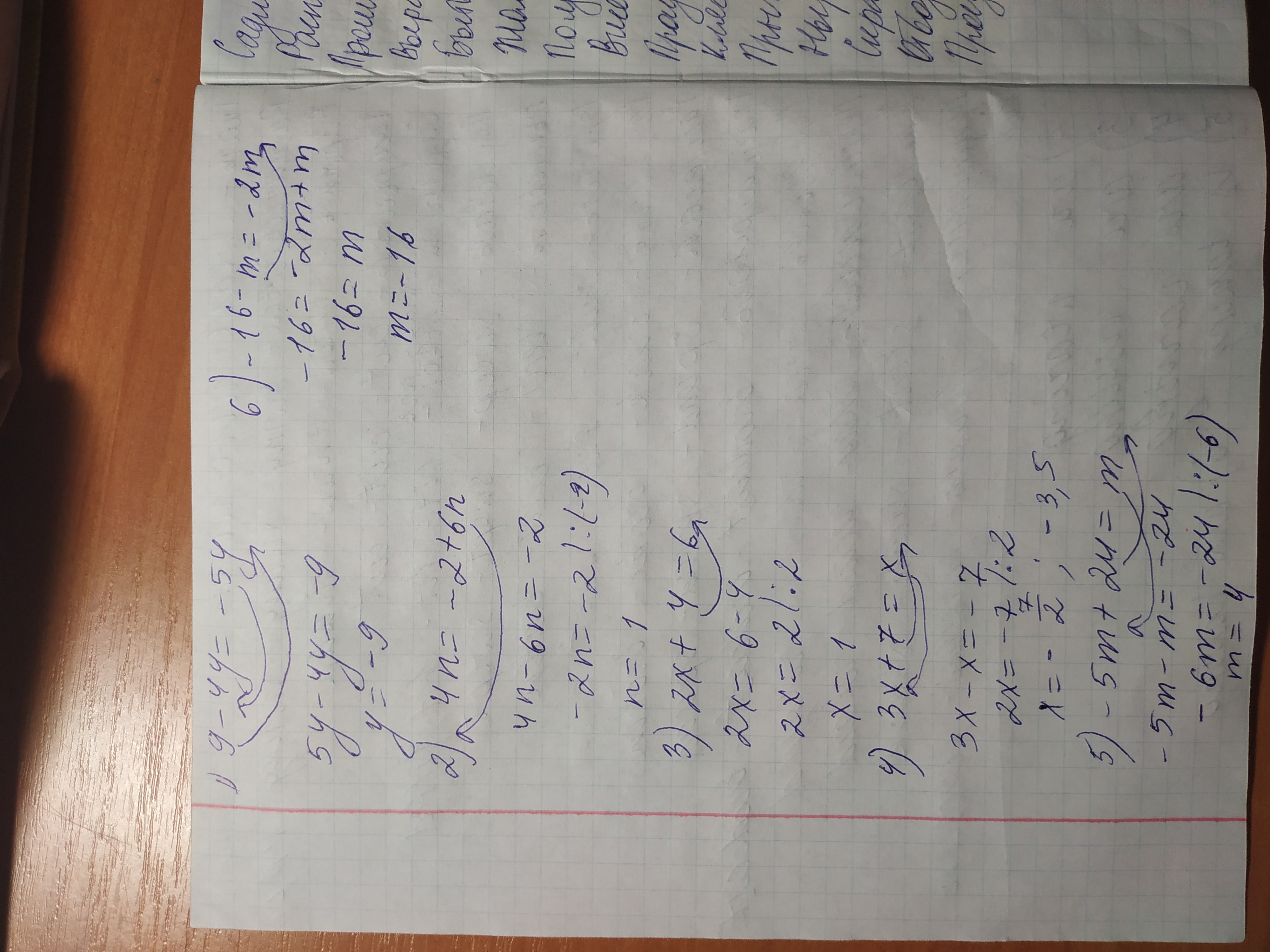 1) 9-4y=-5y 2) 4n=-2+6n 3) 2x+4=6 4) 3x=7=x 5) -5m+24=m