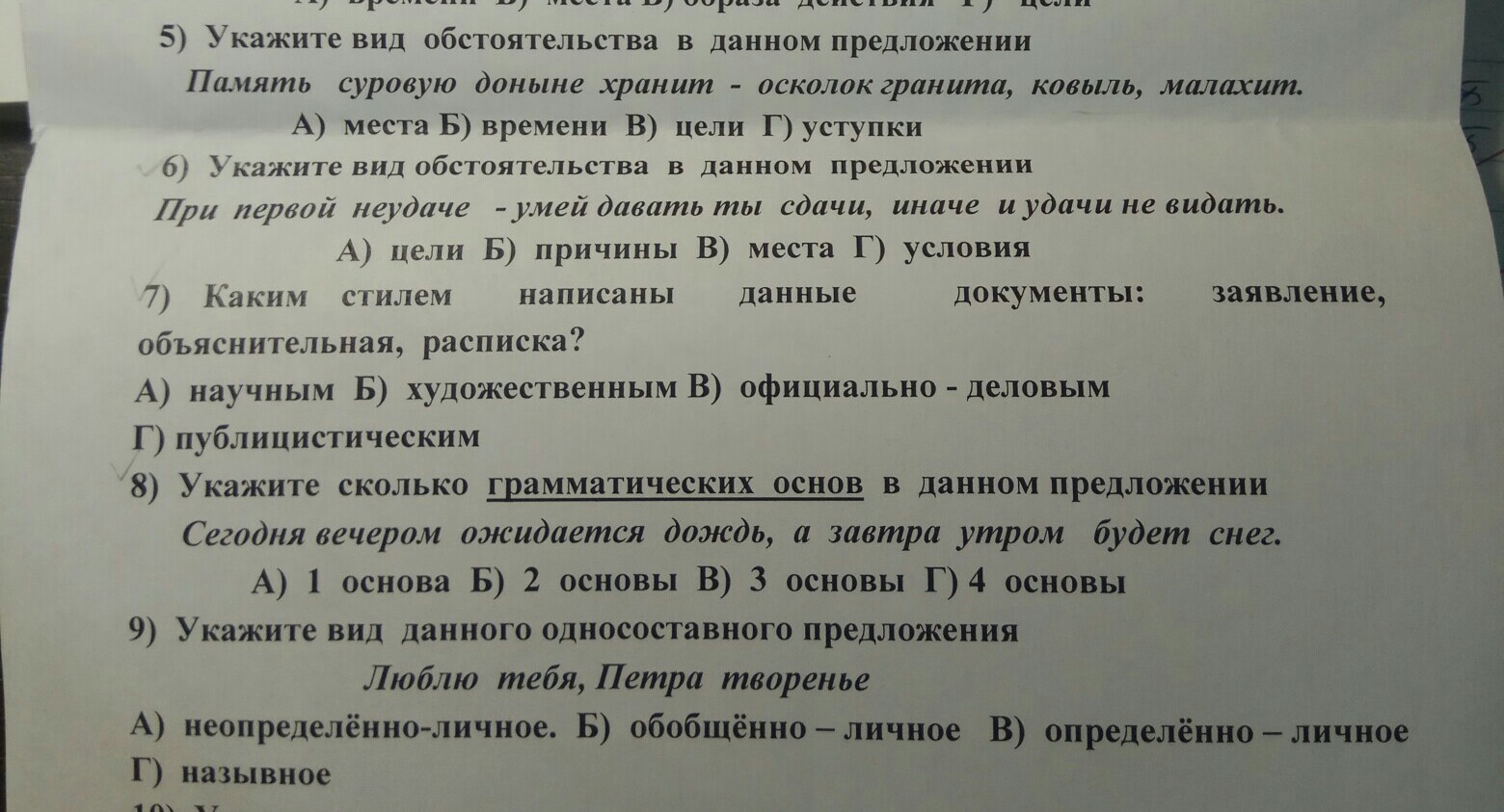 Помогите пожалуйста определить вид обстоятельства. Мне нужны ответы только на 5 и 9 тест. Заранее спасибо
