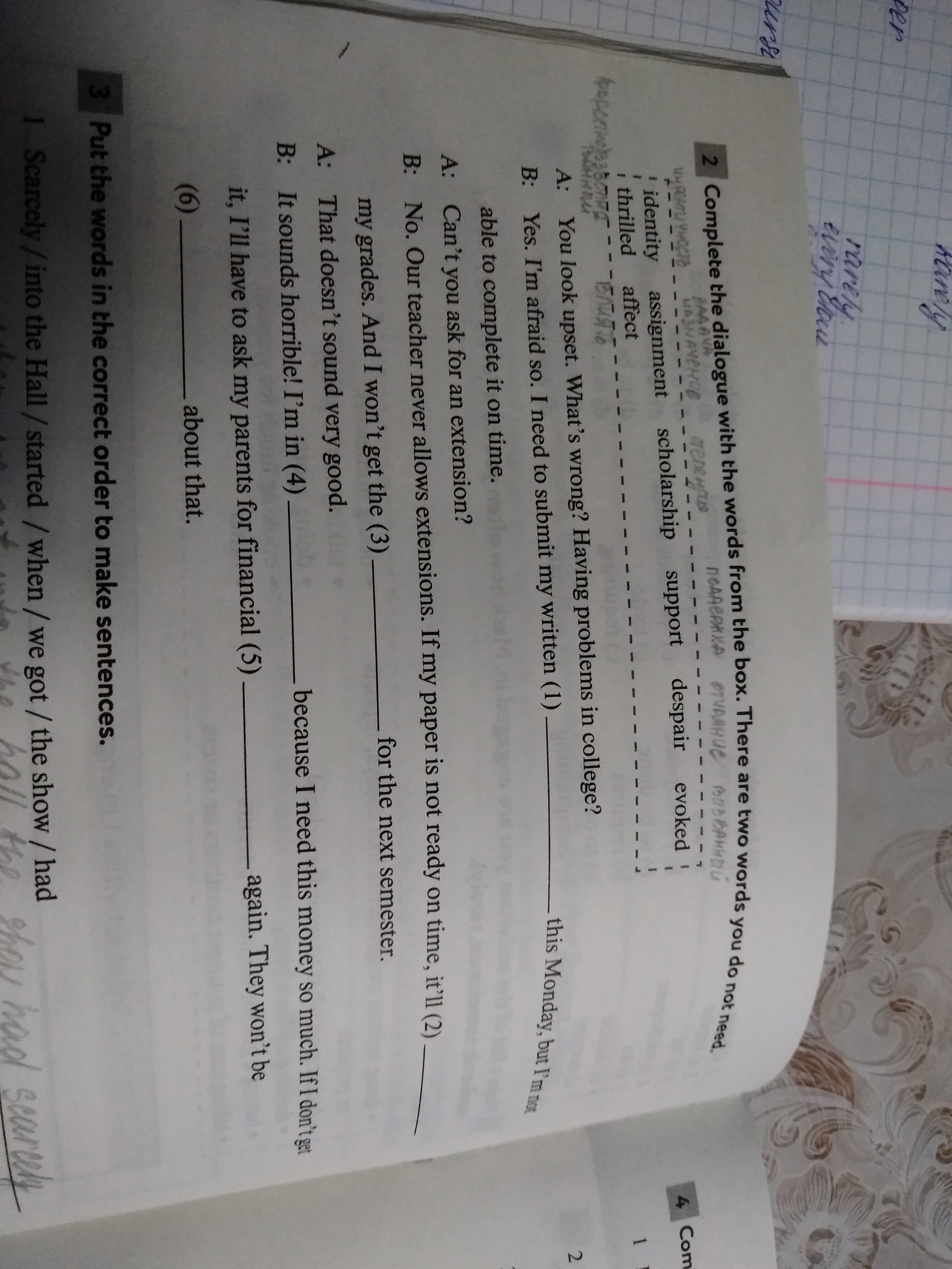 6 thrilled 1 assignment 2 affect 3 scholarship 5 support 4 despair