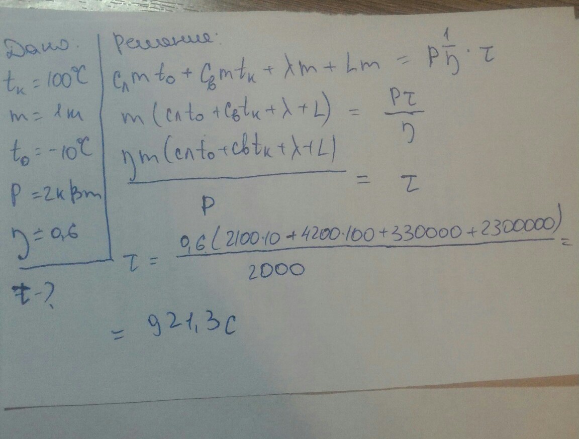 за какое время можно обратиьь в 100 градусный пар 1 кг снега при -10 если мощность электроплиты 2кВт ,а ее кпд 60%