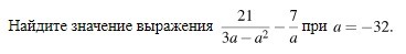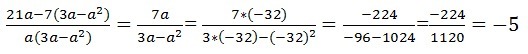 (21a-7(3a-a^2))/(a(3a-a^2))=(7a^ )/(3a-a^2 )= (7*(-32))/(3*(-32)-〖(-32)〗^2 )=-24/(-96-1024)=(-224)/1120= -5
