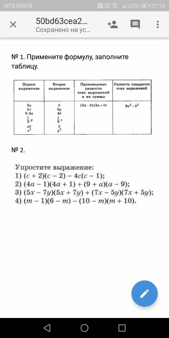 1.)(2x - 3y)(2x + 3y)  = 4x {}^{2}  + 6xy - 6xy - 9y {}^{2}  = 4x {}^{2}  - 9y {}^{2}  \ (0.3a - 3y)(0.3a + 3y) = 0.09a {}^{2} +  0.9ay - 0.9ay - 9y \ ( {?}  {}^{2}  = 0.09a {}^{2}  - 9y {}^{2}  \  ( frac{1}{3} p -  frac{1}{6} c)( frac{1}{3} p +  frac{1}{6} c) =  frac{1}{9} p {}^{2}  -  frac{1}{36} c {}^{2}  \ (ab - 5)(ab + 5) = a {}^{2} b {}^{2}  + 5ab - 5ab - 25 = a {}^{2} b {}^{2}  - 25 \ (x {}^{2}  - y {}^{2} )(x {}^{2}  + y {}^{2} ) = x {}^{4}  - y {}^{4}  \ 2.)(c + 2)(c - 2) - 4c(c - 1) = c {}^{2}  - 4 - 4c {}^{2}  + 4c =  - 3c  {}^{2}  - 4 + 4c \ (4a - 1)(4a + 1) + ( 9 + a)(a - 9)  = 16a {}^{2}  - 1 +  a {}^{2}  - 81 = 17a {}^{2}  - 82 \ (5x - 7y)5x + 7y) + (7x - 5y)(7x + 5y) = 25x {}^{2}  - 49y {}^{2}  + 49x {}^{2}  - 25y {}^{2}  = 74x {}^{2}  - 74y {}^{2}  = 74(x {}^{2}  - y {}^{2} ) \ (m - 1)(6 - m) - (10 - m)(m + 10) = 6m - m {}^{2}  - 6 + m - (10m - m {}^{2}  + 100 - 10m) = 7m - m {}^{2}  - 6 - 100 + m {}^{2}  = 7m - 106