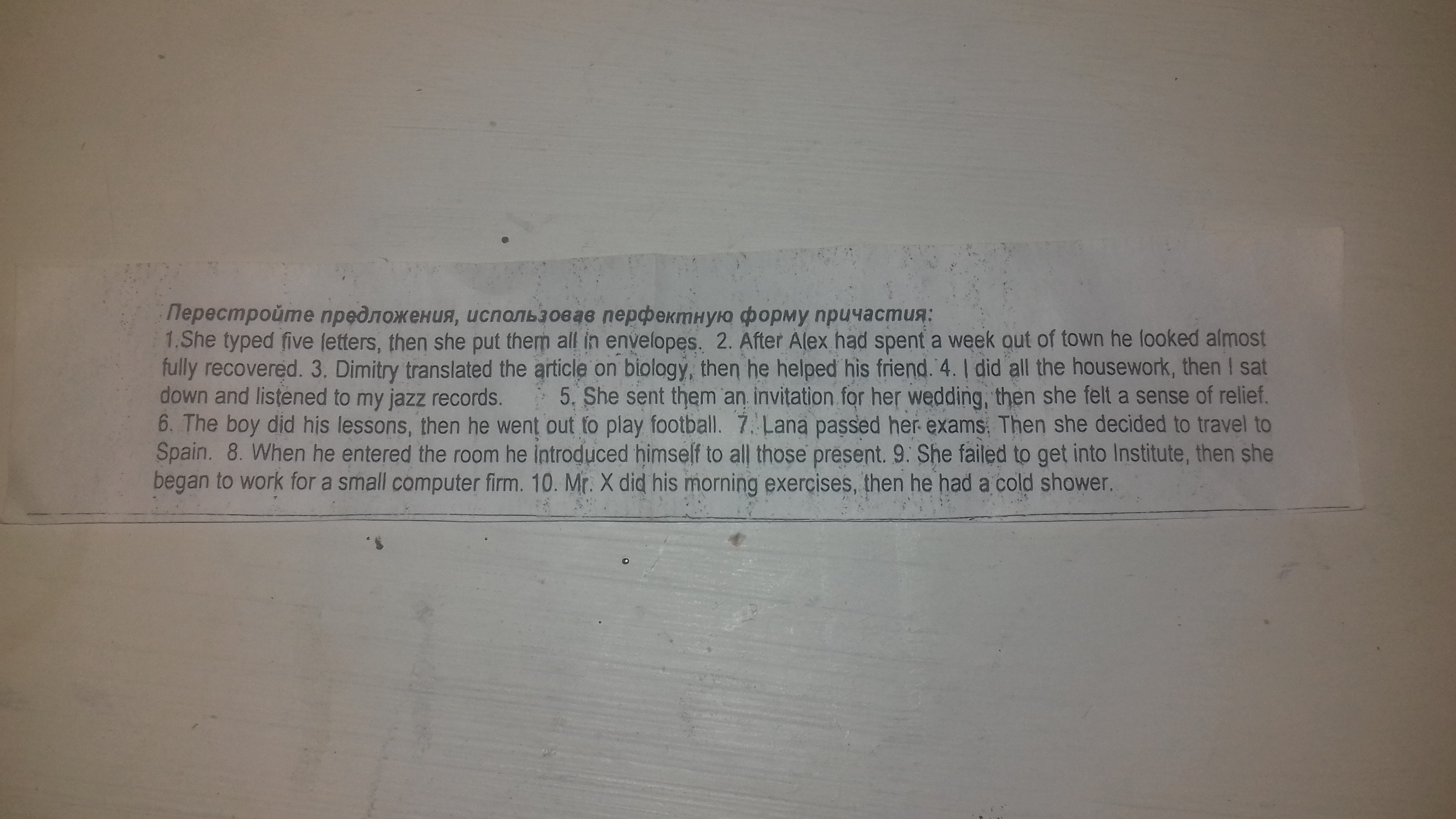 Перестройте предложения, использовав перфектную форму причастия: