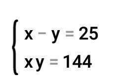 left { {{x-y=25} atop {xy=144}} right.; ; left { {{y=x-25} atop {x(x-25)=144}} right. ; ; left { {{y=x-25} atop {x^2-25x-144=0}} right. \\x^2-25x-144=0; ,; ; D=1201; ,; ; x_{1,2}=frac{25pm sqrt{1201}}{2}\\y_{1}=frac{25-sqrt{1201}}{2}-25=frac{-25-sqrt{1201}}{2}; ,; ; y_2=frac{25+sqrt{1201}}{2} -25=frac{-25+sqrt{1201}}{2}\\Otvet:; ; Big (frac{25-sqrt{1201}}{2}, ;, frac{-25-sqrt{1201}}{2}Big ); ,; Big (frac{25+sqrt{1201}}{2}, ;, frac{-25+sqrt{1201}}{2}Big ); .