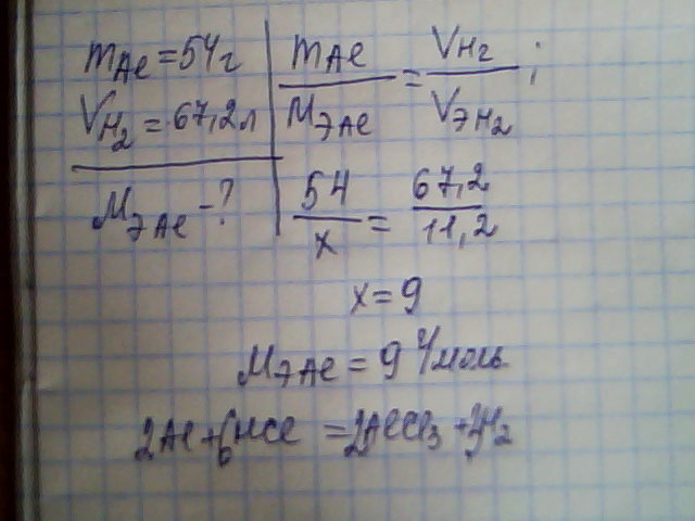 1. Определить молярную массу эквивалента алюминия, если известно, что 54г его вытеснило 67,2л водорода, измеренного при нормальных условиях, из раствора соляной кислоты.