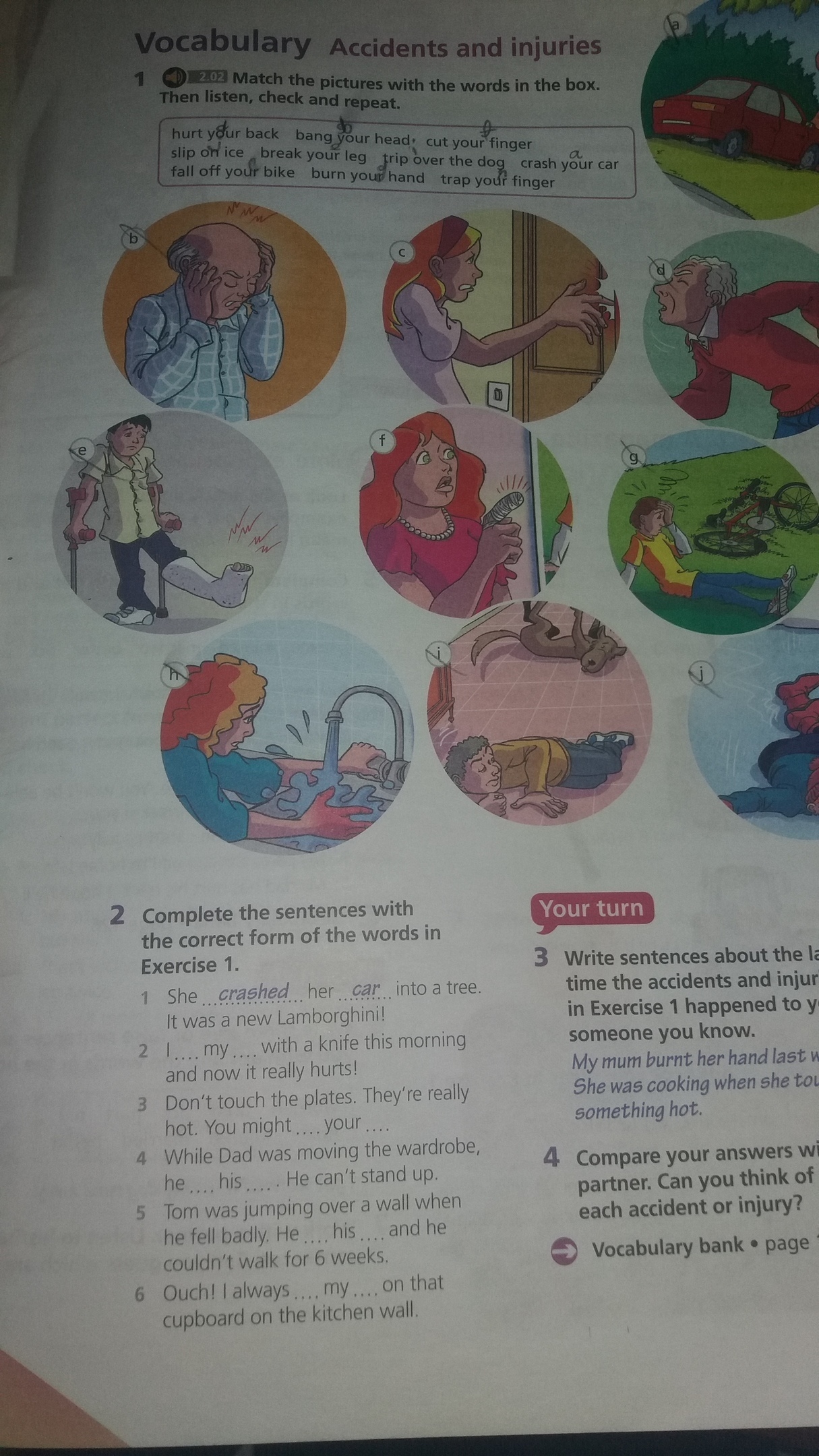 2 сut my finger 3 burn your hand 4 hurt his back 5 broke his leg 6 bang my head