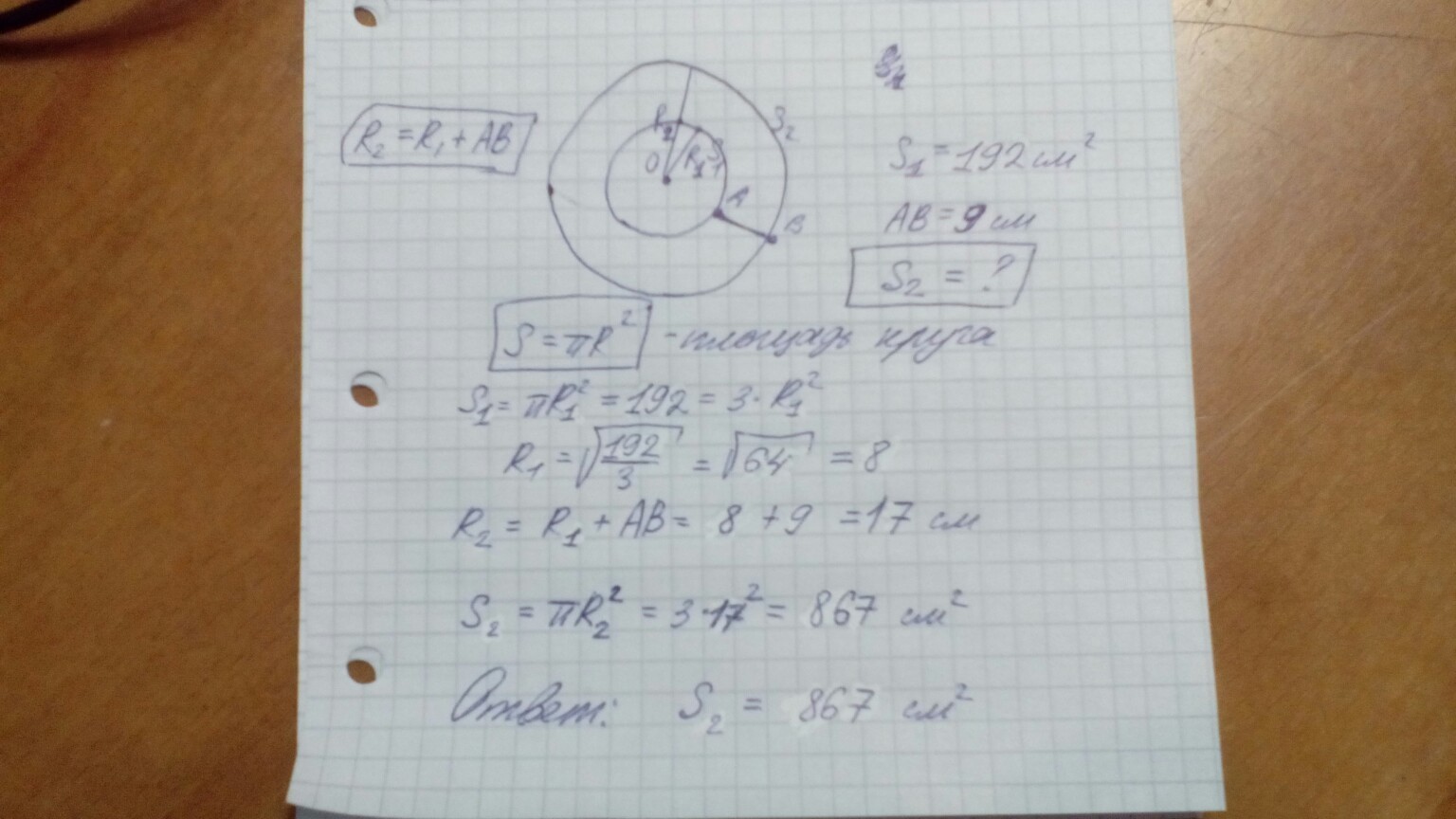 Даны два круга с общим центром O. Площадь меньшего круга равна 192см2. Отрезок AB = 9 см. Значение числа π≈3. Определи площадь большего круга.