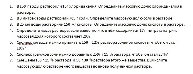 1. Массовая доля хлорида калия в растворе равна отношению массы KCl к массе раствора (вода плюс соль) = 10/(150+10)=10/160=0,0625=6,25%