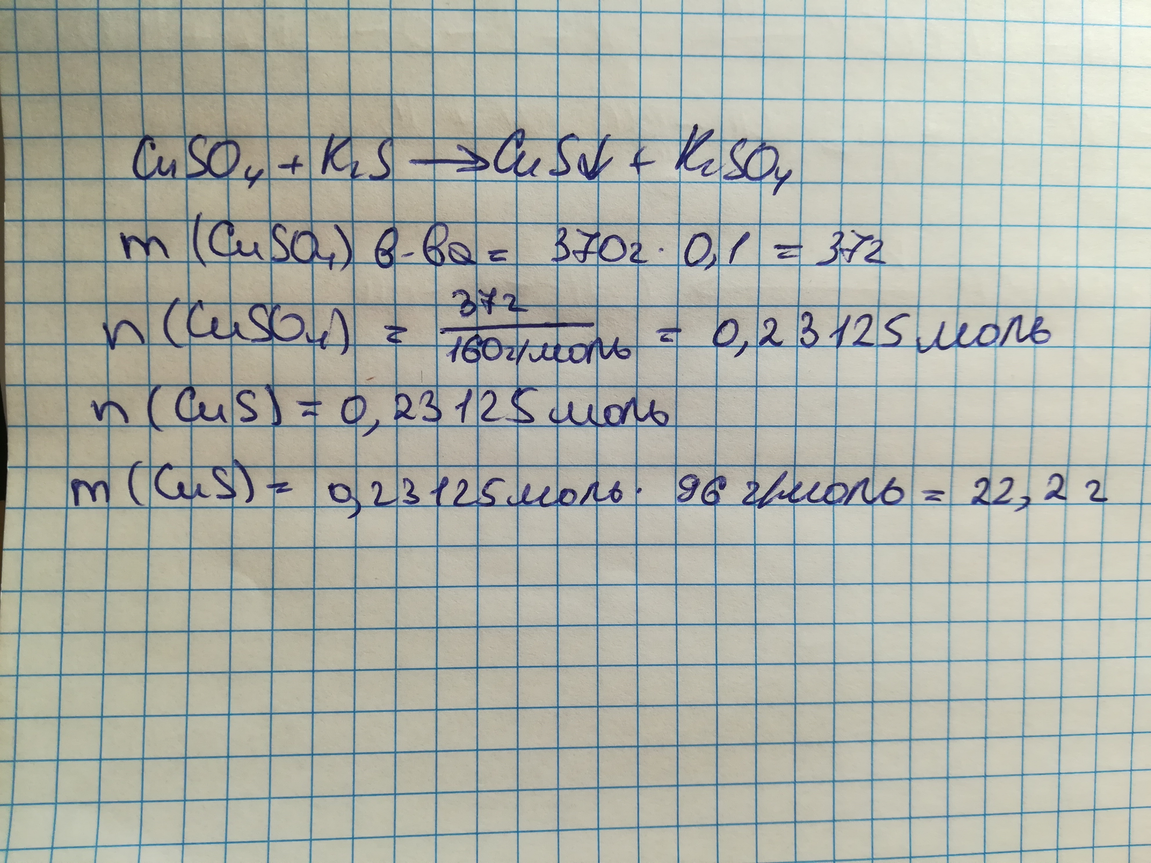 какая масса осадка получится при взаимодействии 370 г раствора сульфата меди с массовой долей растворенного вещества 10% с избытком раствора сульфида калия