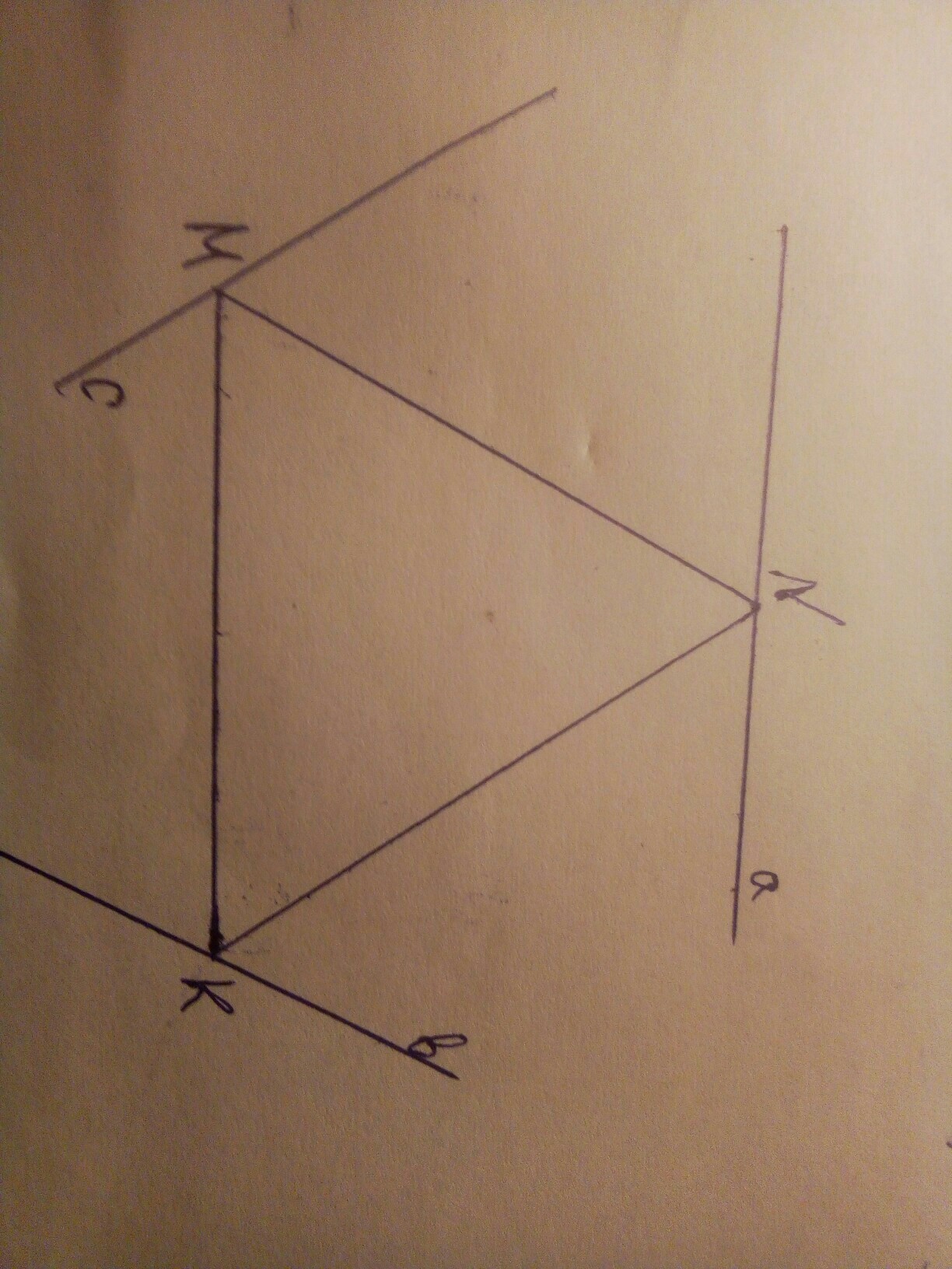 Начертите треугольник MHK и проведите через каждую вершину прямую, параллельную противоположной стороне треугольника.