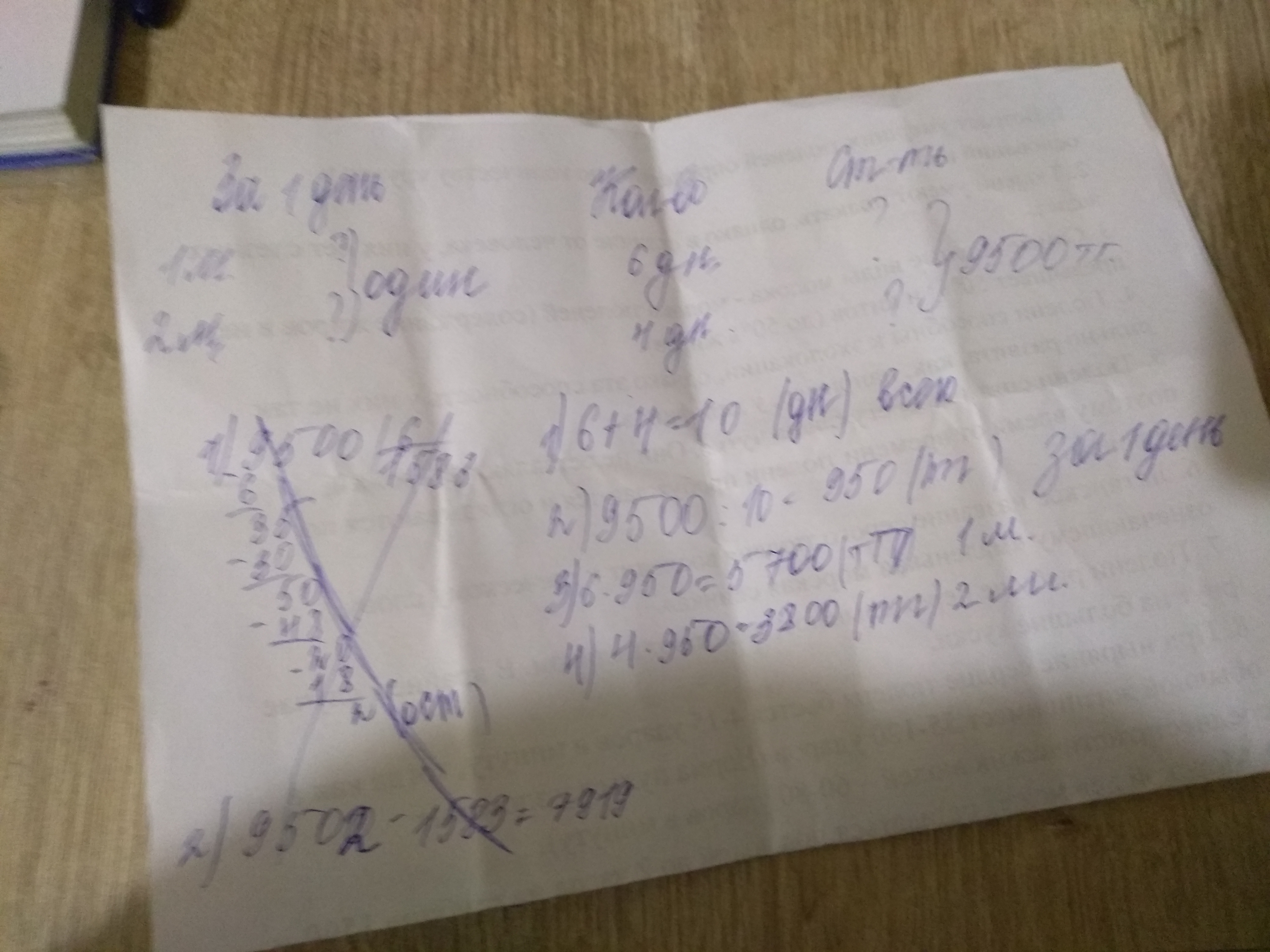 Два маляра получили за работу 9500.первый работал 6 дней второй 4 дня сколько денег долженполучить каждый ,еслиплата за один день была одинаковой?
