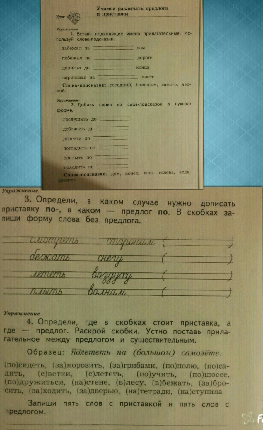 2)дослушать до конца,добежать до финиша,донести до дама,погладить по голове,поплыть по воде,походить по снегу