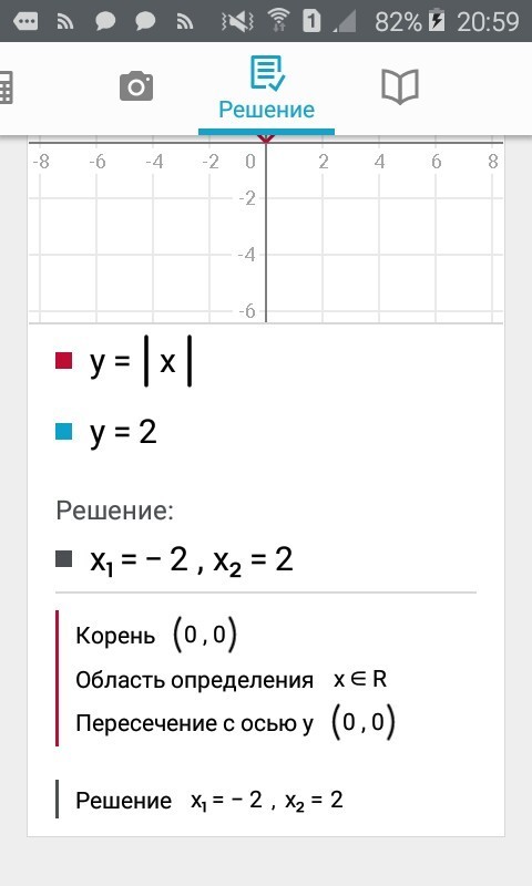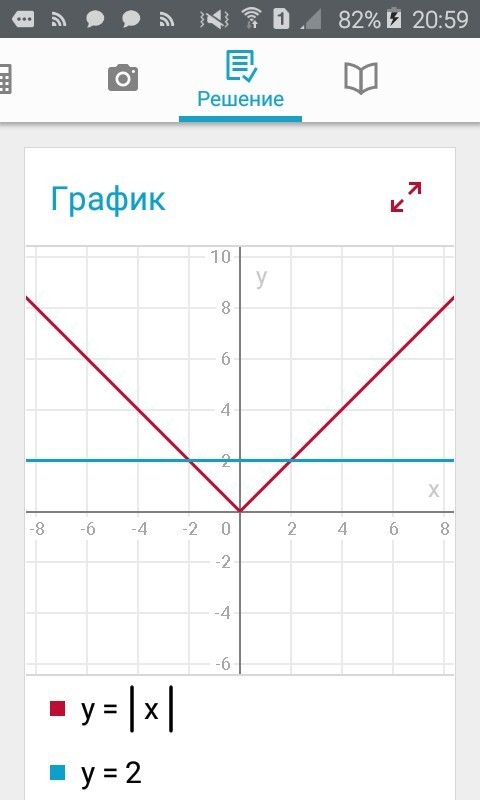 Представляешь |x|=2 в виде y = |x| и y = 2. Получаются два графика и их точки пересечения будут являться корнями уравнения, т.е. x₁ = -2 и x₂ = 2.