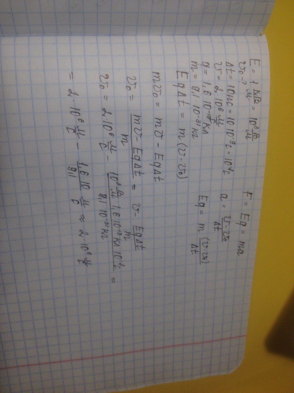 Электрон влетает в однородное электростатическое поле перпендикулярно линиям напряженности поля. Модуль напряженности поля Е=1кВ/м. Найдите модуль скорости Vo, с которой влетел электрон в поле, если через промежуток времени ∆t=10нс модуль его скорости V=2×10^6 м/с.