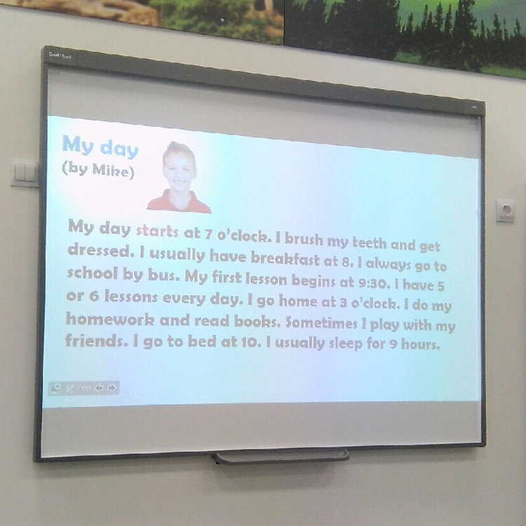 Мой день начинается 7 часов. Я чищу зубы и одеваюсь. Обычно я завтракаю в 8. Я всегда иду в школу с автобусом. Мой первый урок начинается 9:30. Каждый день Я имею 5-6 уроков. Я иду домой в 3:00 .Я делаю уроки и читаю книгу. Иногда я играю с друзьями. Я иду спать 10. Обычно я сплю 9 часов