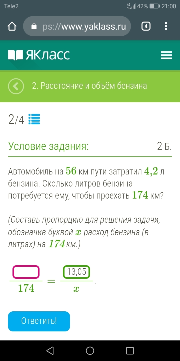Автомобиль на 56 км пути затратил 4,2 л бензина. Сколько литров бензина потребуется ему, чтобы проехать 174 км?
