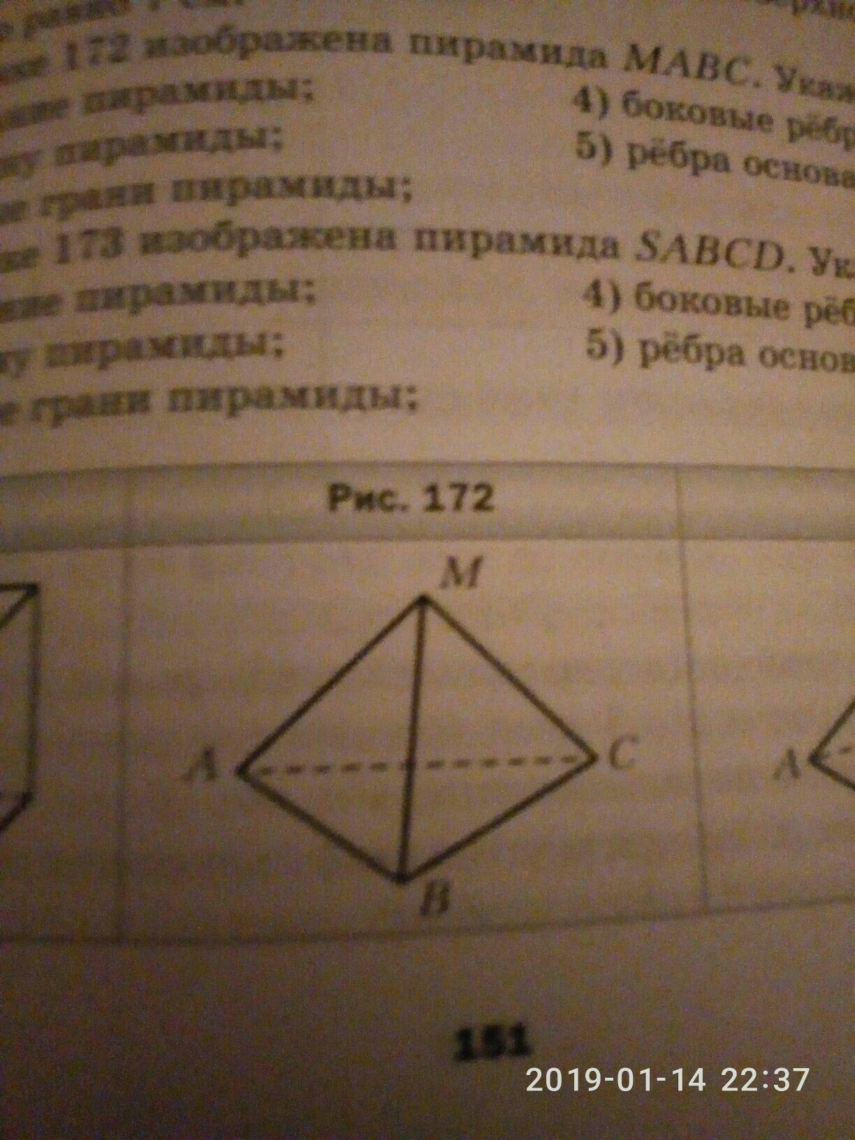 на рисунке 172 изображена пирамида MABC Укажите основание пирамиды вершины пирамиды боковые грани пирамиды боковые рёбра пирамиды рёбра основания пирамиды, Срочно пж