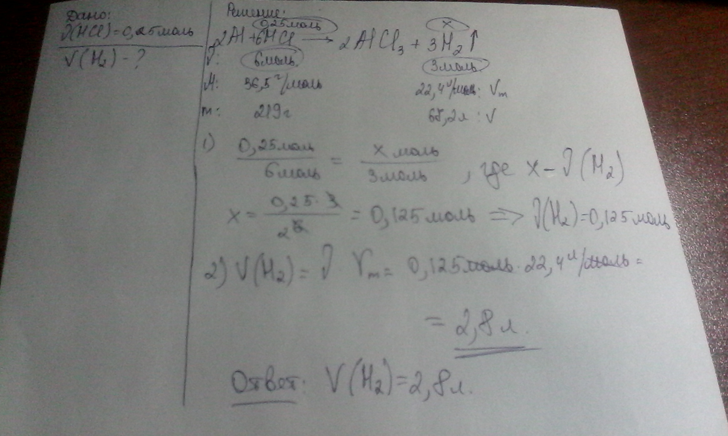 какой объем водорода образуется при взаимодействии алюминия с раствором соляной кислоты содержащей hcl химическим количеством 0.25 моль