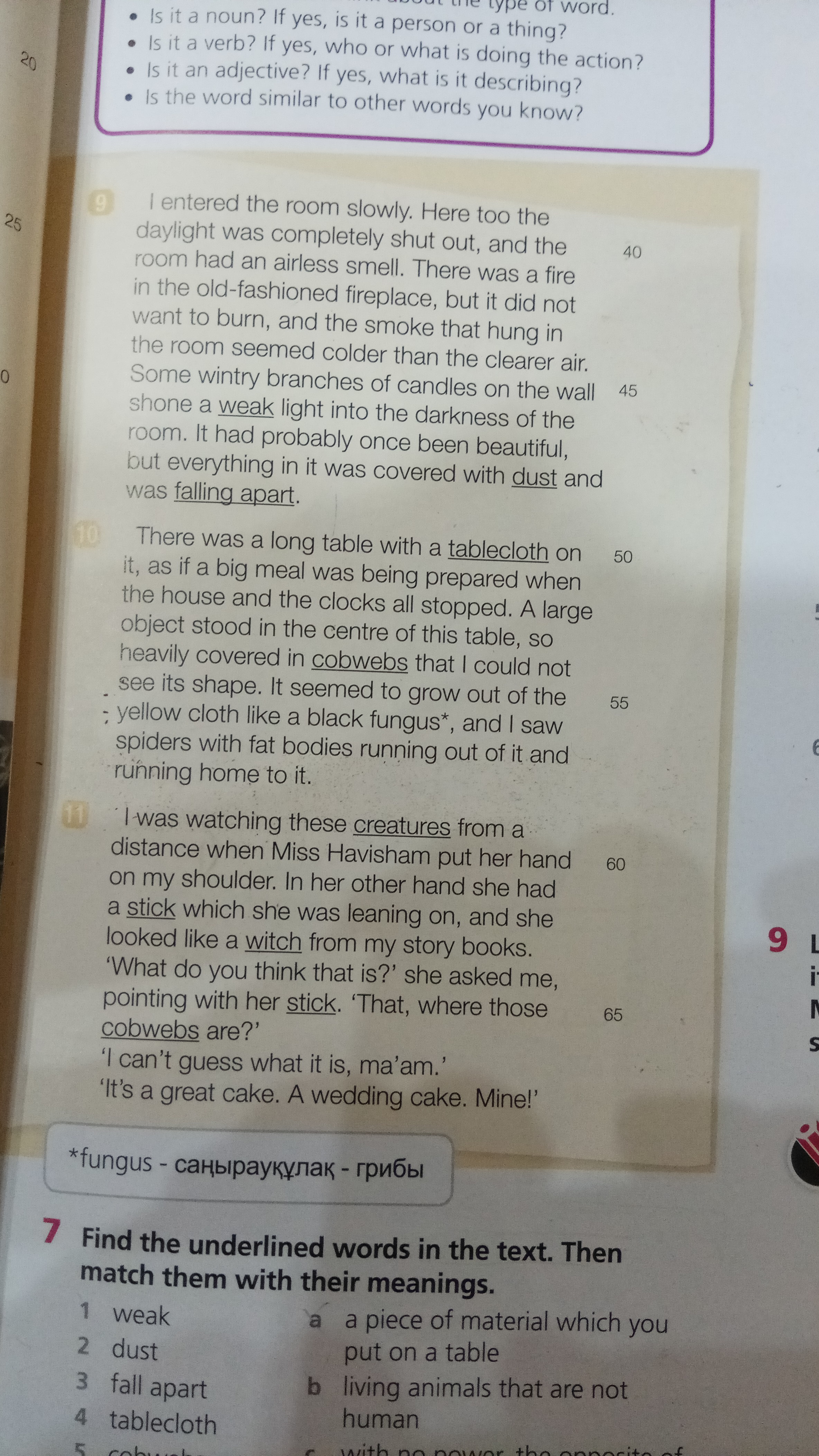 медленно вошел в комнату. Здесь также был полностью закрыт дневной свет, и в комнате был безвоздушный запах. В старомодном камине был огонь, но он не хотел загореться, и дым, который висел в комнате, казался холоднее, чем чистый воздух. Некоторые зимние ветви свечей на стене слабо освещали тьму. номер. Наверное, когда-то он был красивым, но все в нем было покрыто пылью и разваливалось. На мне был длинный стол со скатертью, как будто готовилась большая еда, когда дом и часы остановились. В центре этого стола стоял большой предмет, настолько сильно покрытый паутиной, что я не мог видеть его форму. Казалось, он вырос из сс: желтая ткань, похожая на черный грибок, и я увидел пауков с тучными телами, выбегающими из него и бегущими к нему домой. Я наблюдал за этими существами издалека, когда мисс Хэвишем положила руку мне на плечо. В другой руке у нее была палка, на которую она опиралась, и она выглядела как ведьма из моих рассказов. Как ты думаешь, что это? она спросила меня, 60, указывая своей палкой. Что, где эти 5 паутин? - Я не могу догадаться, что это, мэм. Это отличный торт. Свадебный торт.