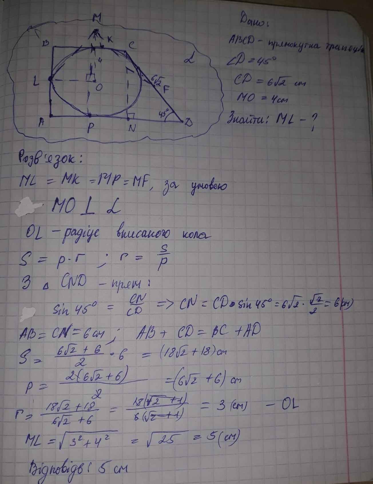 Прямокутна трапеція з гострим кутом в 45° і більшою бічною стороною, яка дорівнює 6√2 см, розташована на площині α. На відстані 4 см від площини α знаходиться точка, рівновіддалена від кожної сторони трапеції. Знайдіть відстань від цієї точки до сторін трапеції.