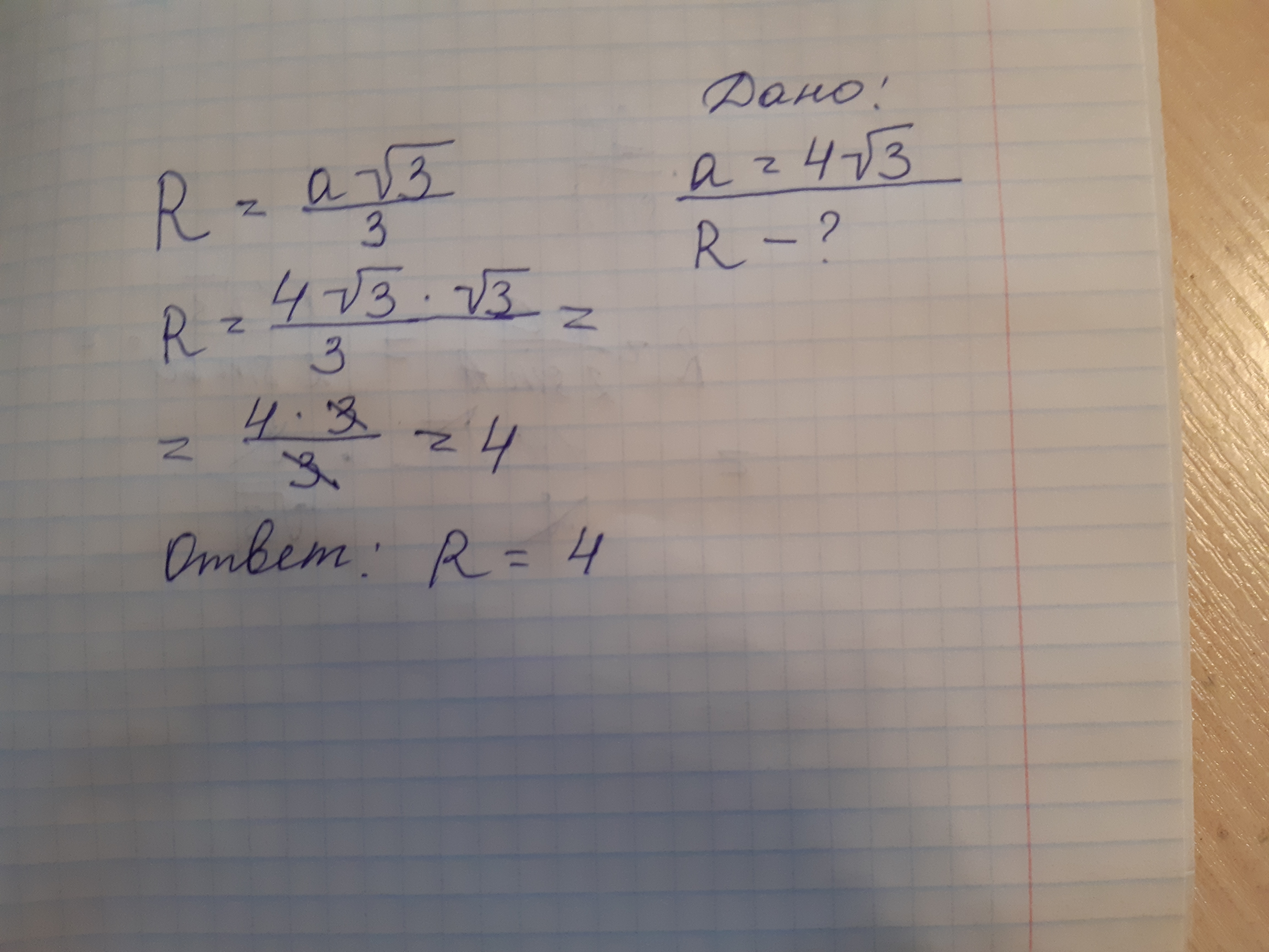сторона равностороннего треугольника равна 4корень из 3 найдите радиус окружности описанной около этого тр