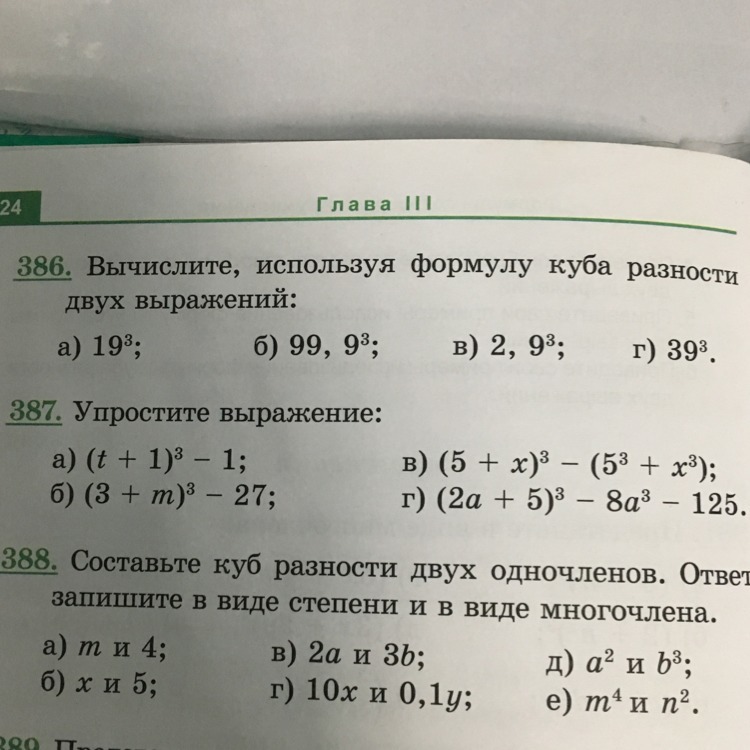 Помогите пожалуйста номер 386. Тема такая: «Куб суммы и куб разности двух выражений». Заранее спасибочки...