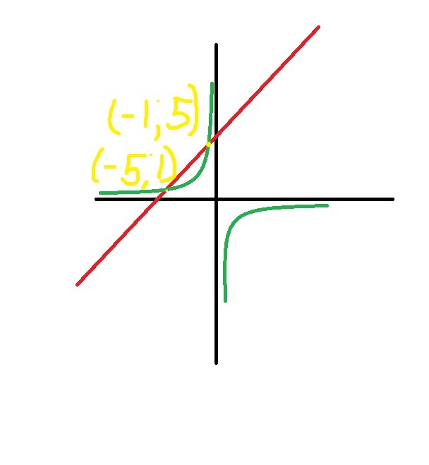 для решения уравнения графически нужно в декартовой системе координат начертить функции х + 6 и -5/х, точки пересечения я обозначил желтым (-1 ; 5) и ( - 5 ; 1)