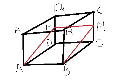 Раз сечение проходит через точки A и B, то сторона AB находится на этой плоскости, также плоскость делит ребро СС₁ на точке M, которая середина для нее CM=MC₁ так как KM║DC║D₁C₁