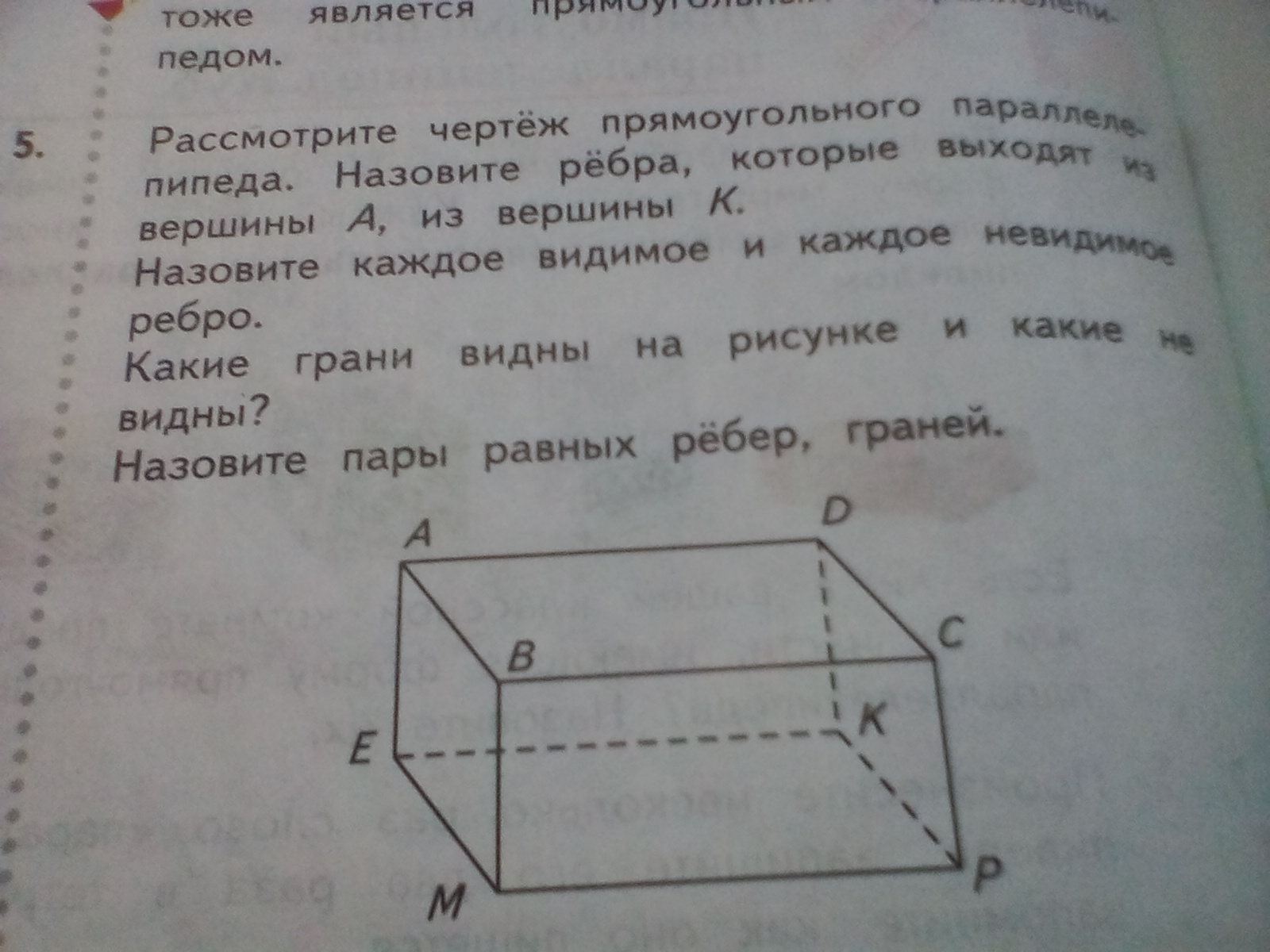 Упражнение 5 помогите с назовите каждое видимое и невидимое ребро, и назовите пары равных рёбер, граней плииз